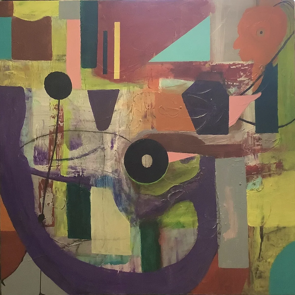 In Shared Frequency, layered geometry and sweeping movement suggest the echo of a shared moment sussuspended in time. A central circular form recalls the quiet ritual of vinyl---two people leaning closer to hear what mattered. Surronding architectural shapes and translucent textures create a sense of memory constructed in fragments: colour, sound, presence. The composition balances structure and emotion, much like the way music carries both rhythm and feeling. This piece reflects on connection---not only through the invisible frequencies we share with one another across time.